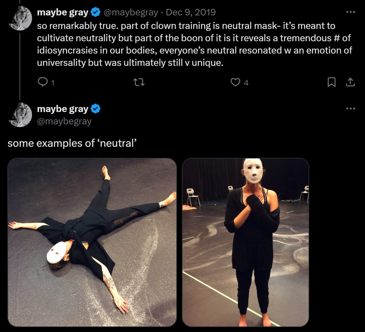 In clowning, you have the ‘neutral mask’, and every little quirk and deviation from that (chest slightly more in, a particular sway in your walk) adds to how the character that is you appears in the world; infinite variation and infinite nuance.